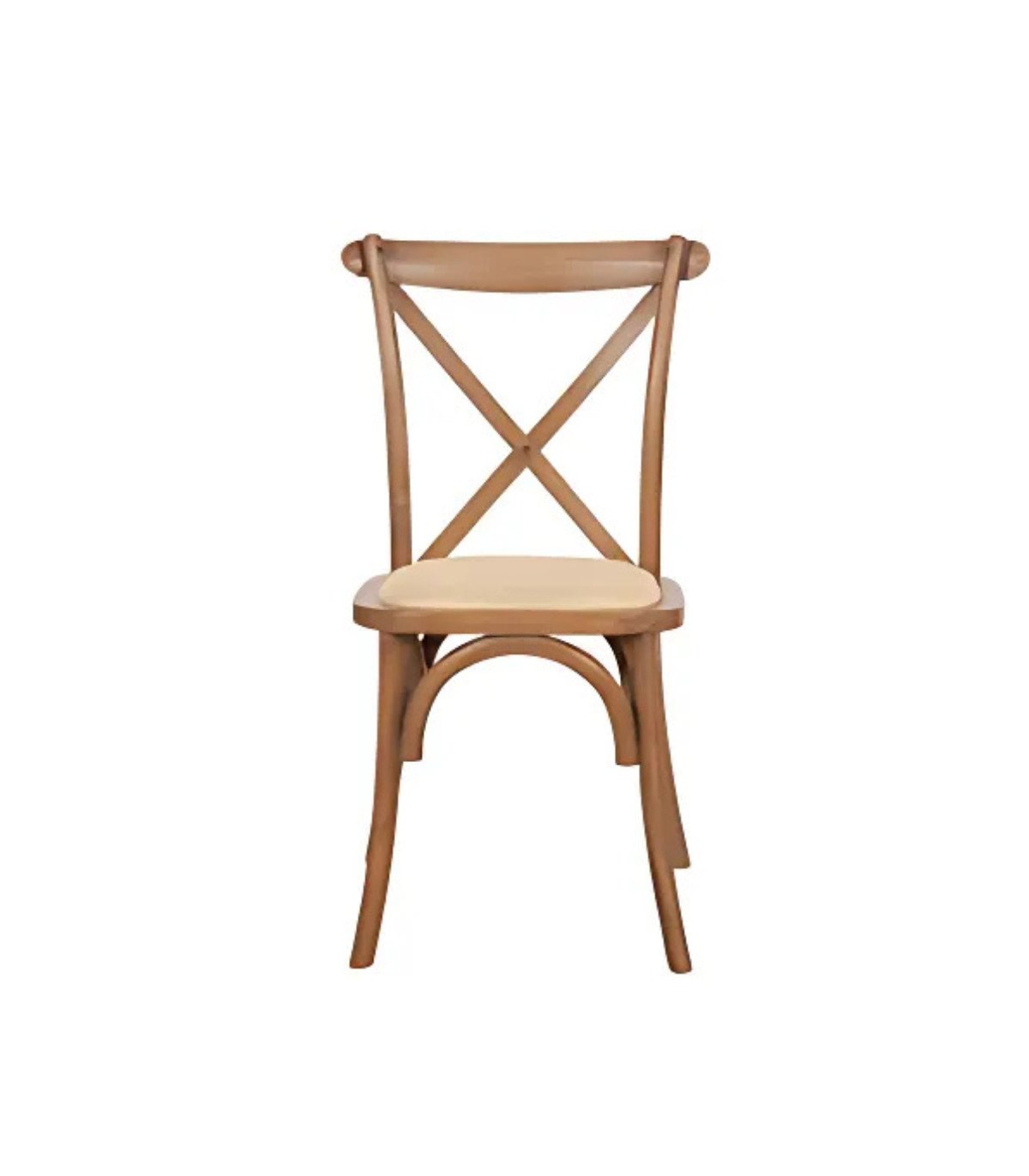 At 126 Events, we offer this light wood cross-back chair for hire, with quick pickup from our showroom in Pantin or express delivery to your event venue in Paris, Île-de-France, or anywhere in France on request.