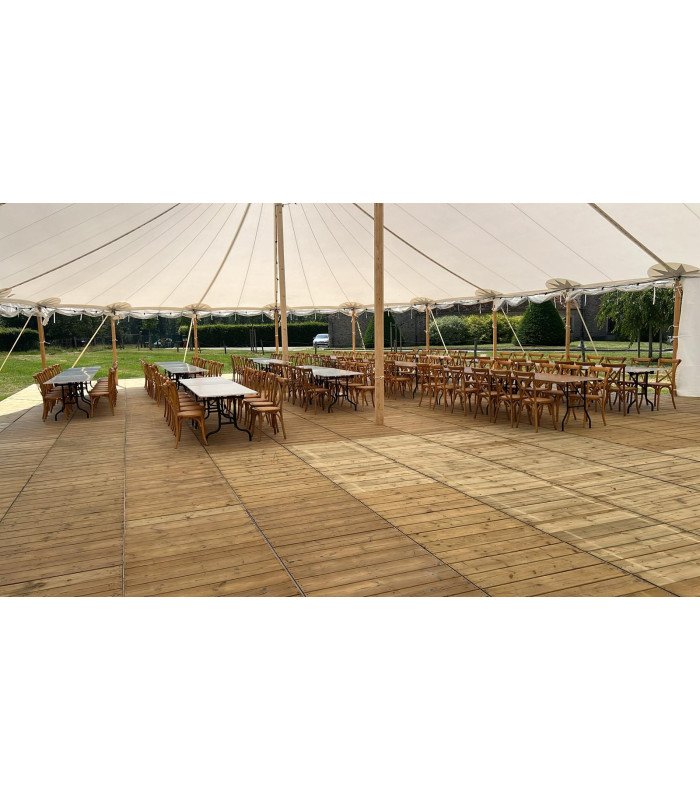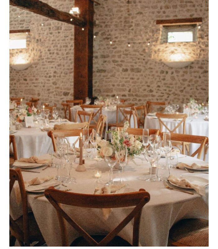 For a harmonious look, combine this Provence wooden chair with our rustic wedding tables available for hire. We offer a wide range of wooden reception furniture, perfectly designed to create a warm atmosphere: benches, round tables, sideboards, floral arches, bar tables, and natural decorative elements.