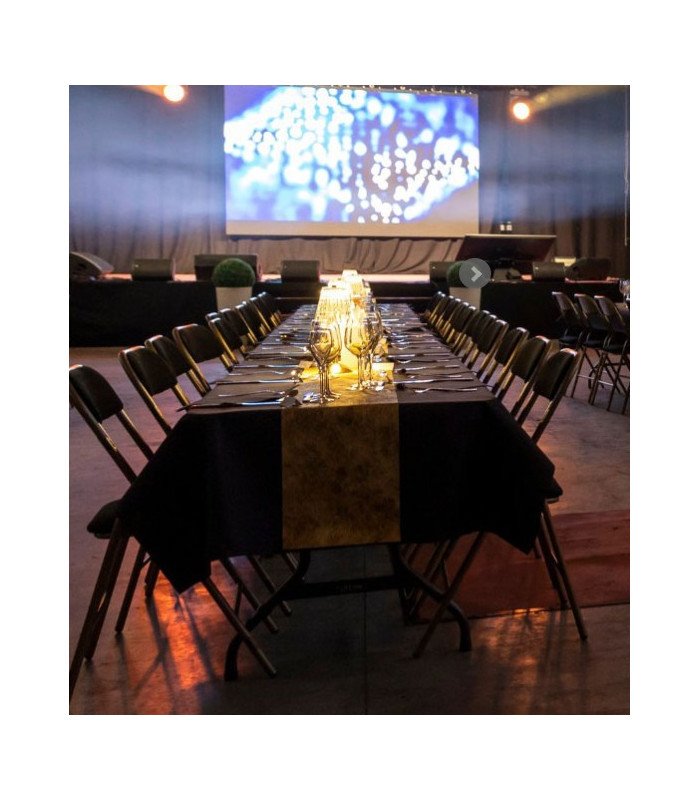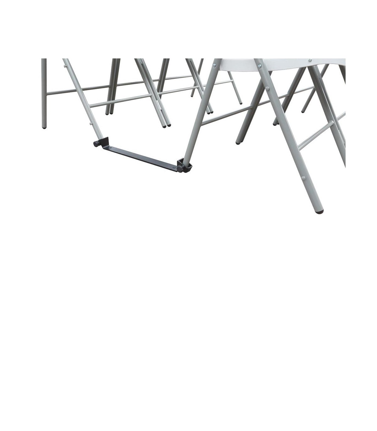 Black folding reception and conference chair for rent with inter-row connecting bars (additional and on request) special connecting bar for Apolline chair (right side) left side link bar Weight: 4.5 kg H 82.5 cm (seat height 48 cm x L 42 pro 51 cm Fire classification: AM18