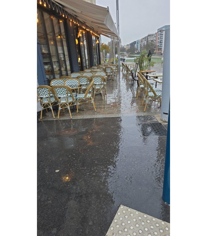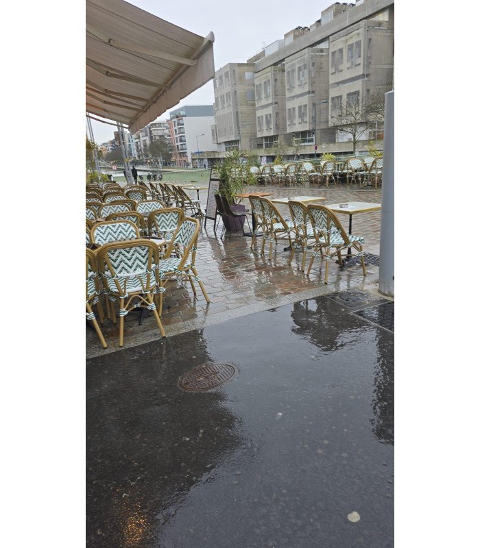 Rent a green and white woven resin chair in the Parisian terrace style for your outdoor events