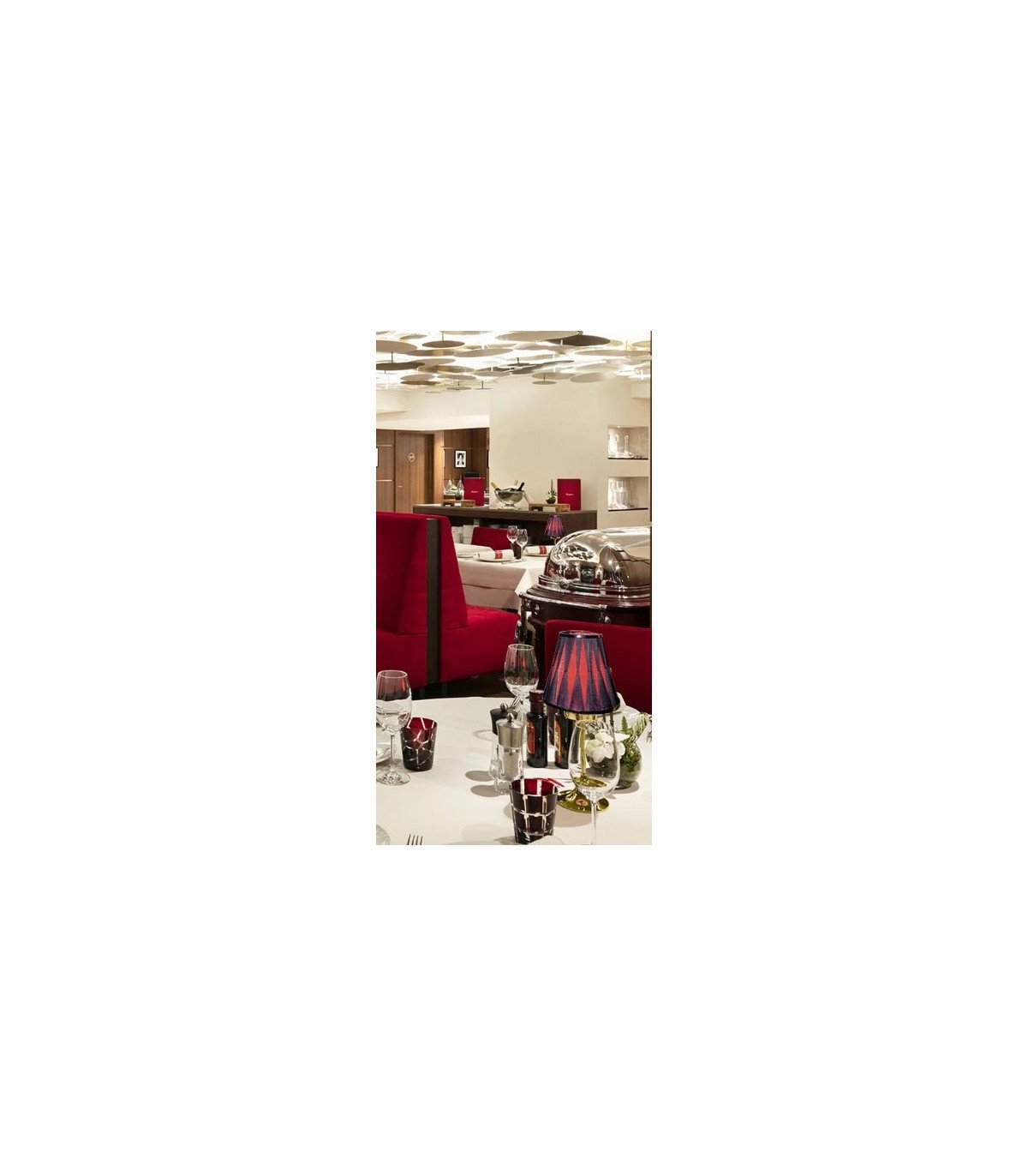 This elegant LED lamp is available to rent. It features a pleated white shade and a brushed brass base.