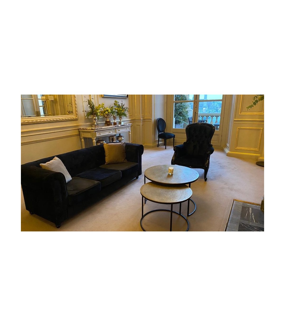 This black velvet medallion chair combines comfort and visual elegance. Its oval backrest provides classic balance, while the deep black fabric reinforces a sober and refined atmosphere. This single-seat model fits easily into any type of event seeking character without excess. Ideal for a refined setting, this chair is available for rental with or without other matching furniture.