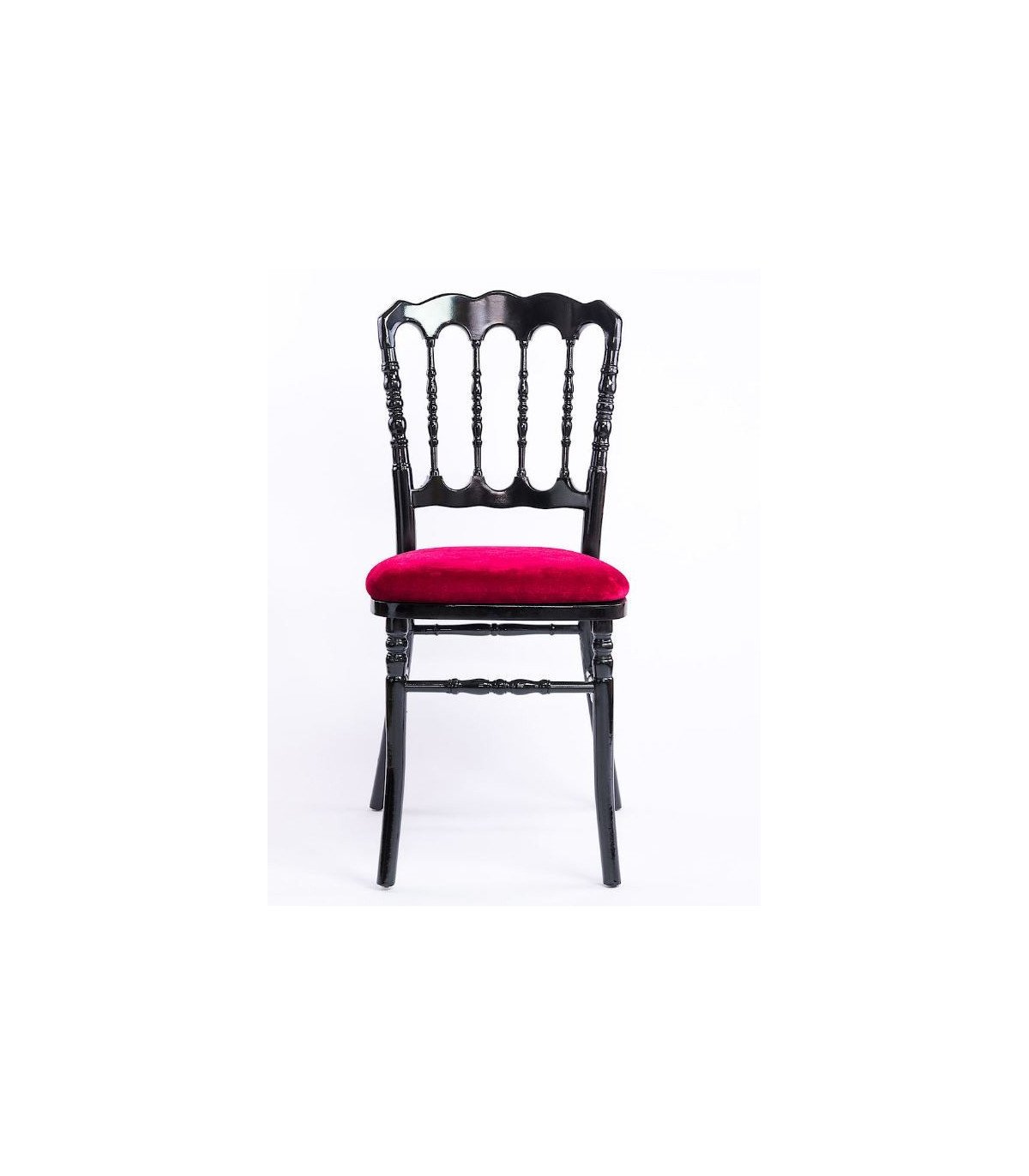 The black Napoleon III chair with red or black seat is a classic piece of event furniture. Its black frame provides a simple, structured base, while the red cushion, available as an optional extra, adds a striking visual touch without being excessive. This model is regularly chosen for receptions, sit-down dinners, or ceremonies that require elegant, stable seating that can be easily integrated into different settings. Its format allows for smooth installation, both indoors and in sheltered outdoor areas, with an immediate sense of the desired style.