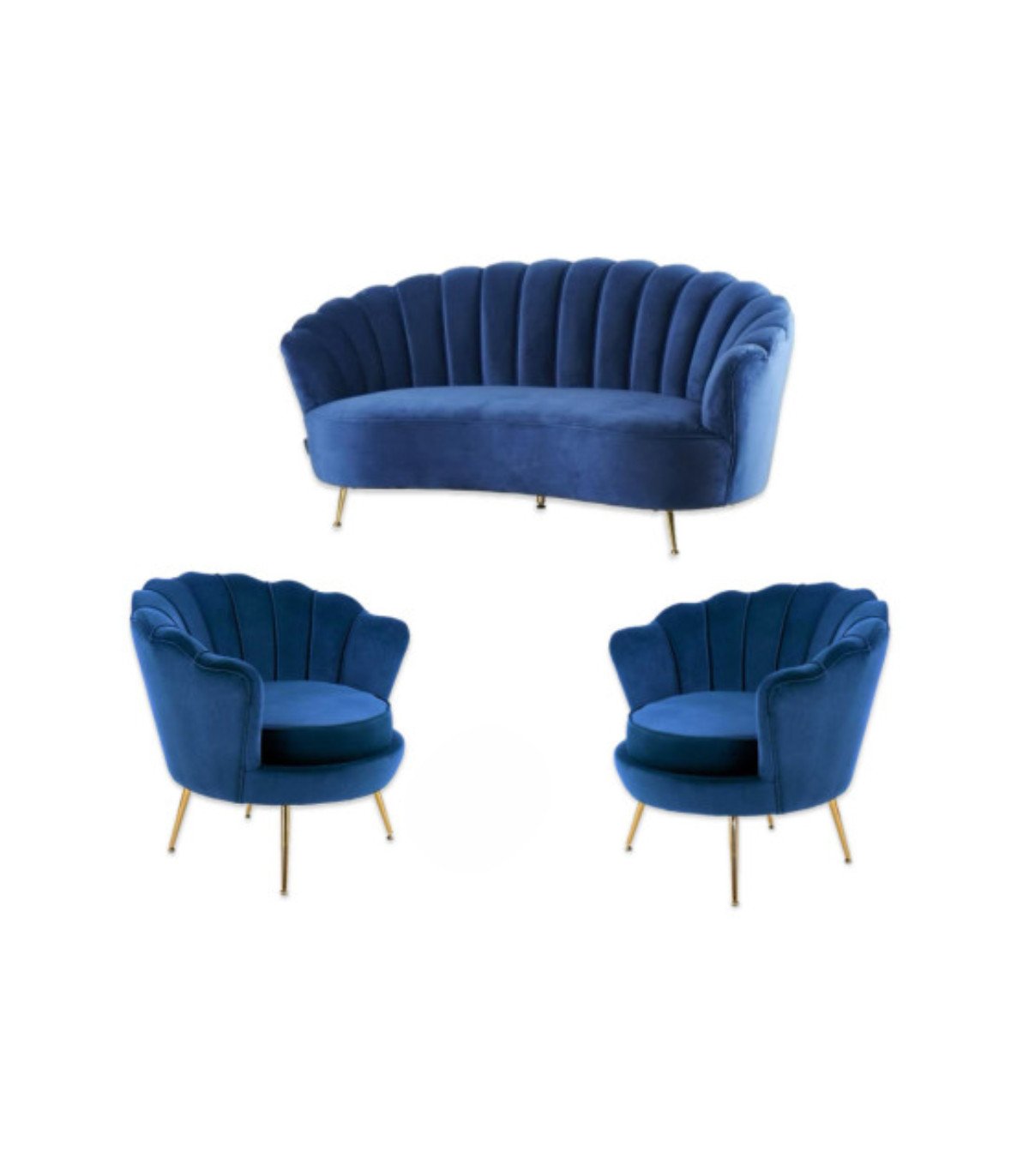 Comprising one shell-shaped sofa and two armchairs in blue. Add a touch of elegance and modernity to your events with our Shell-Shaped Furniture Pack, available to hire. With its refined design, this pack is ideal for creating a welcoming and sophisticated space.