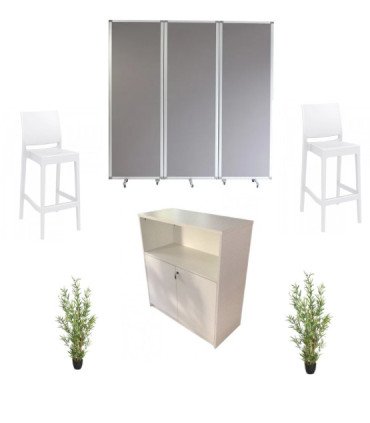 This white finish lounge package allows you to create a bright and structured reception area in a professional booth. It brings together several essential elements to organize a visible point of contact, facilitate exchanges, and delimit the space without closing it off. The composition combines a white reception desk, two matching high chairs, a mobile acoustic partition, and decorative plants. The set provides an immediate overview of the booth and easily adapts to trade show and exhibition configurations.