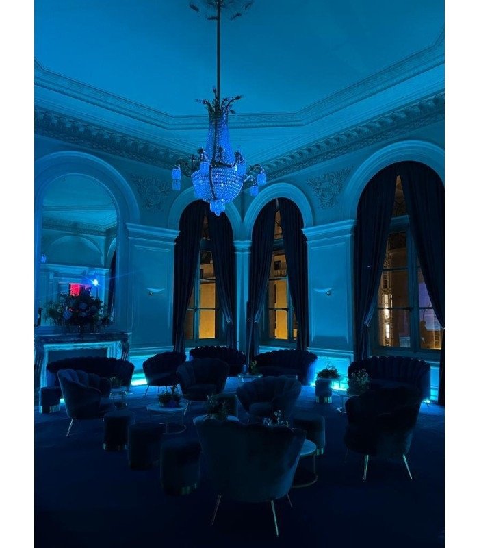 To complete your decor, rent our lounge sofa with round back in blue velvet and gold legs