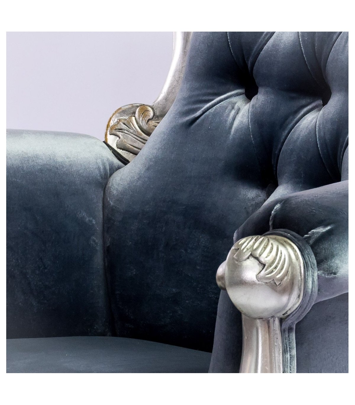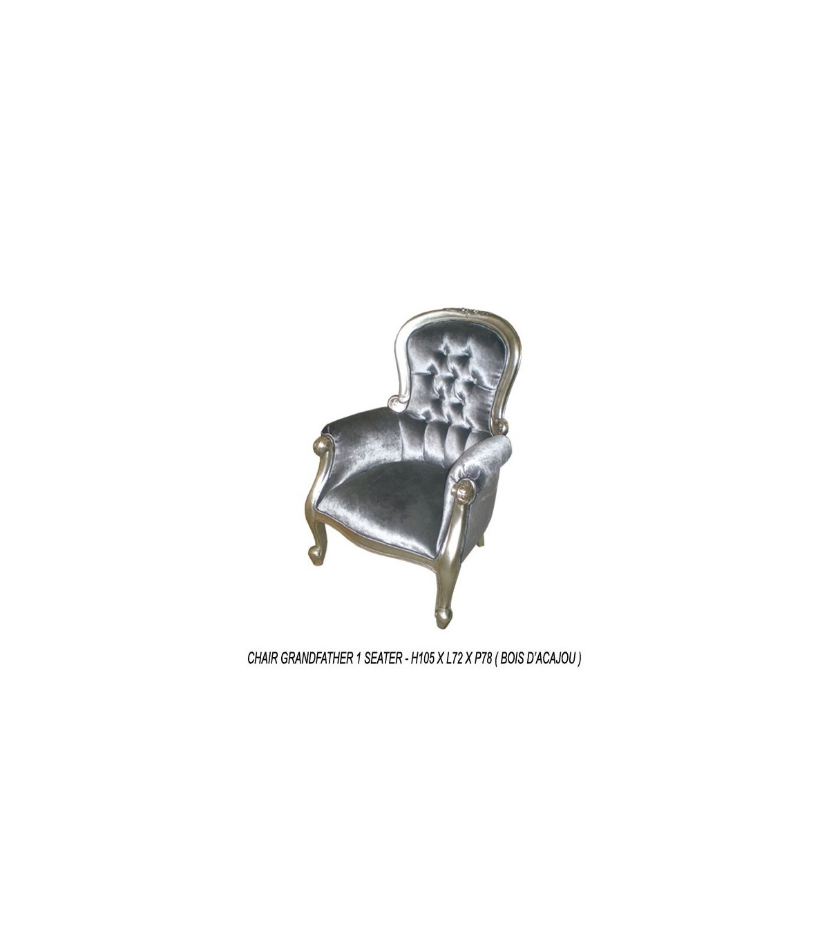 Déco Privé, the armchair rental specialist, offers you to rent this captioned armchair in grey velvet and mahogany wood with a silver leaf patina
