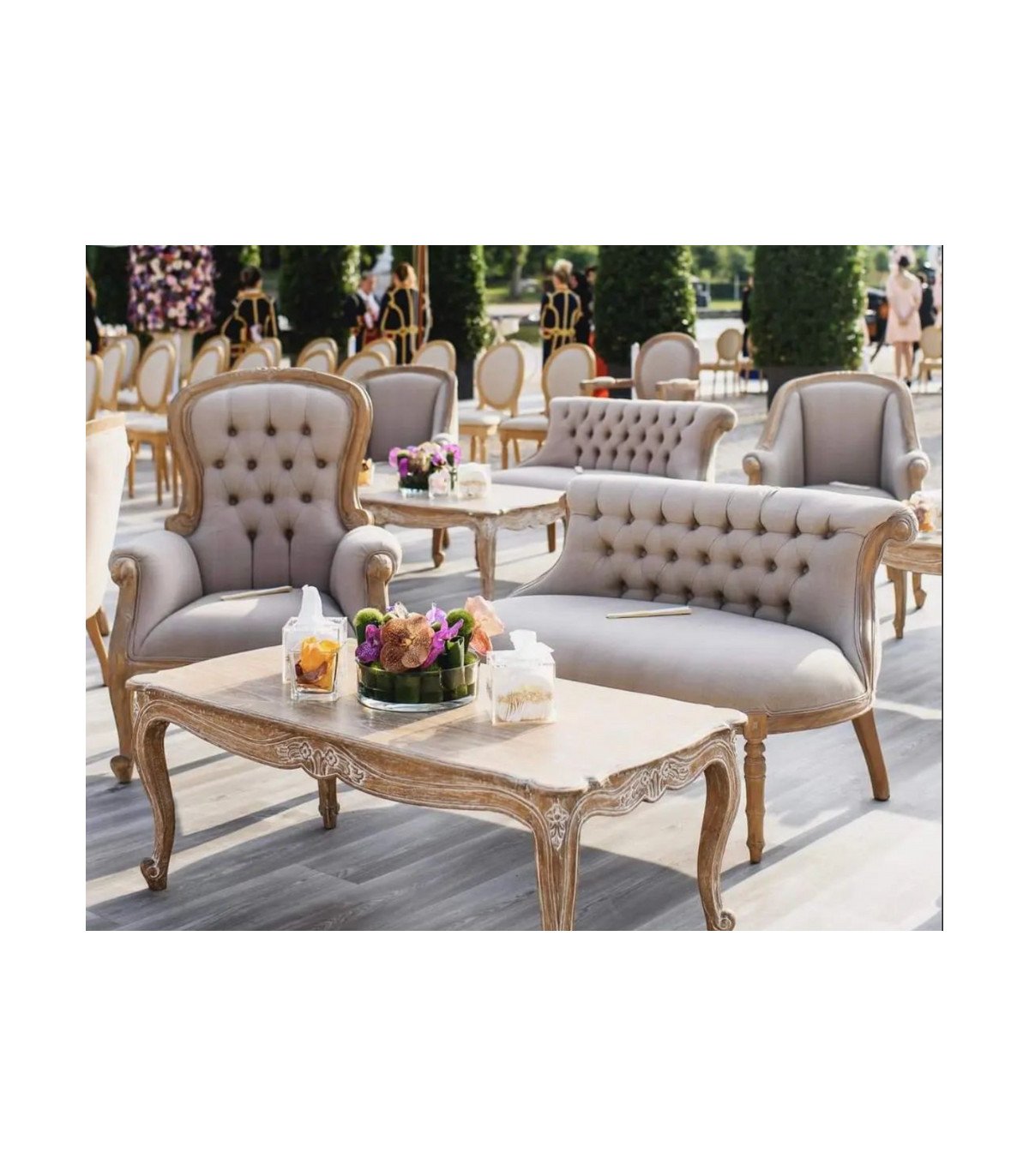 This Milano wedding pack combines comfortable seating in linen fabric with a ceruse wood structure to create an elegant, harmonious space. It includes an armchair, a matching banquette and a coffee table, forming a set designed to welcome your guests in a refined and convivial atmosphere. Available for rental, it is ideal for wedding receptions, cocktail parties and lounge areas.