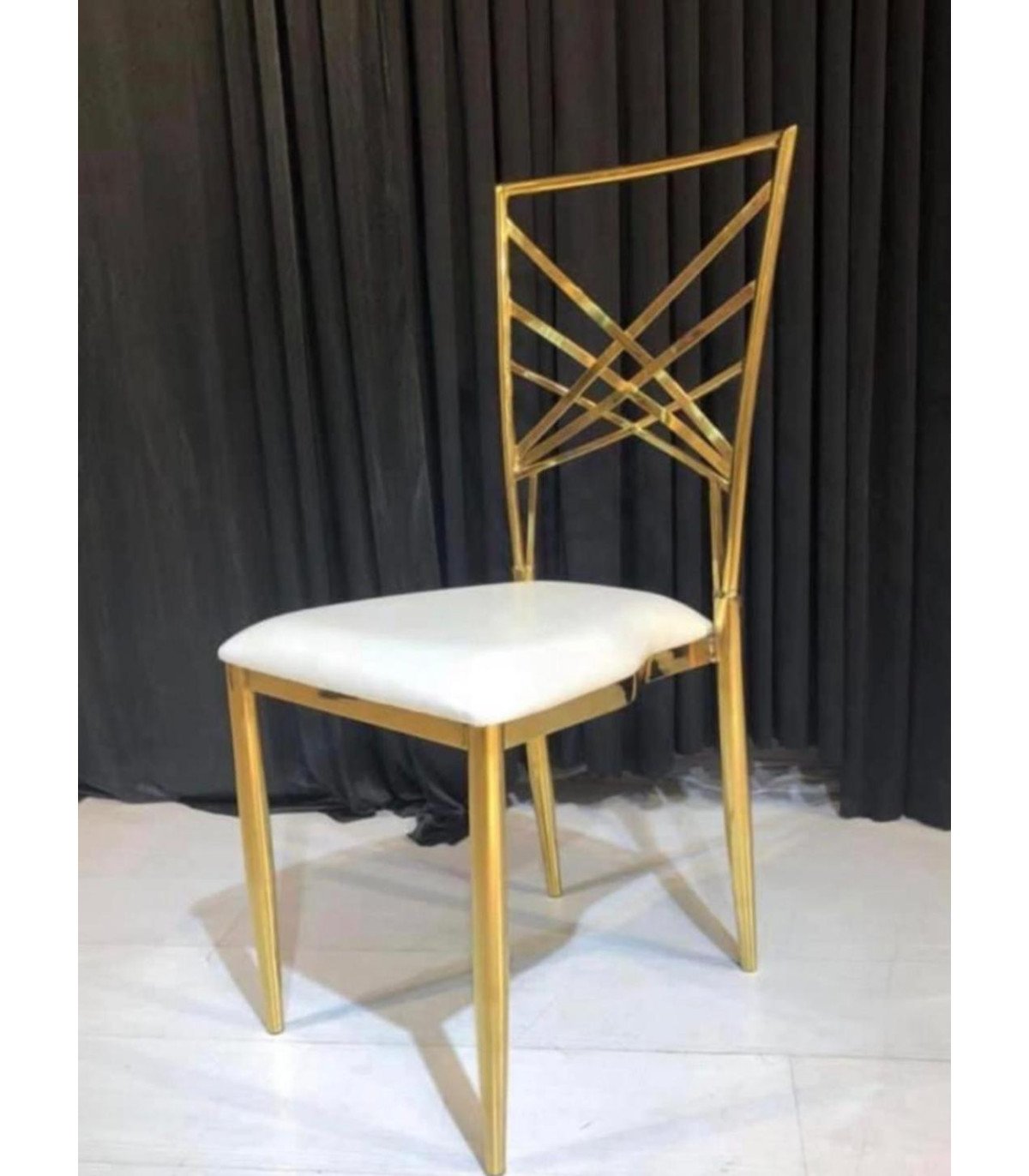 Succès assuré pour une décoration de mariage avec notre modèle de chaise dossier en métal or croisé et galette blanche