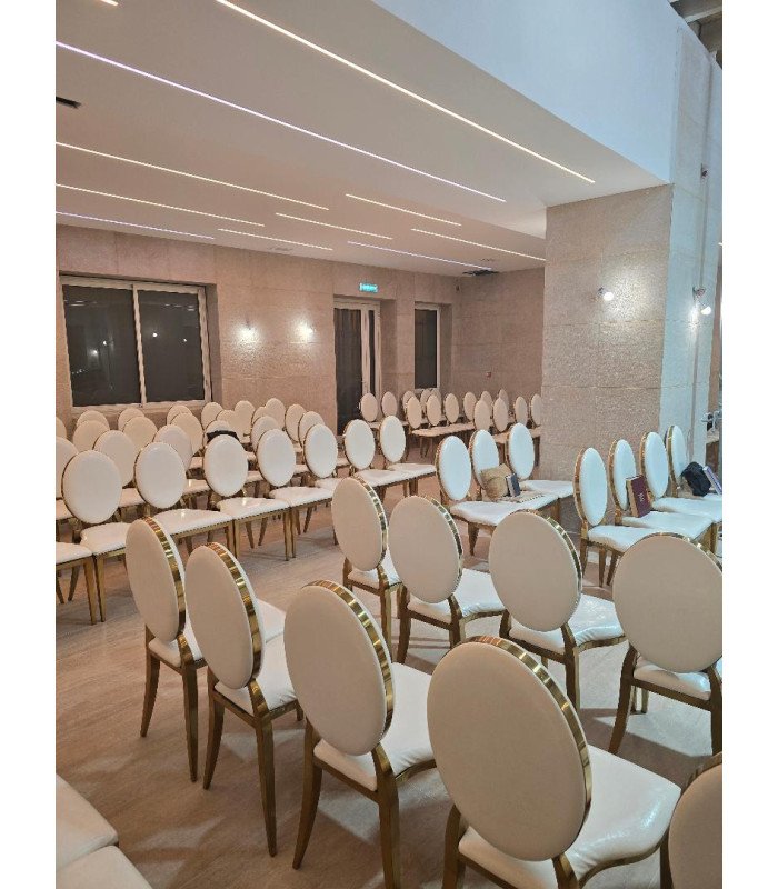Pensée pour les événements qui allient esthétique et fonctionnalité, cette chaise médaillon en métal doré avec assise en imitation cuir blanc offre une assise confortable tout en apportant une touche visuelle élégante. Sa structure en métal assure une bonne stabilité, tandis que son dossier ovale rappelle les lignes classiques du mobilier de réception. Facile à manipuler et empilable jusqu’à 4 unités, elle répond parfaitement aux contraintes logistiques des événements professionnels et privés.