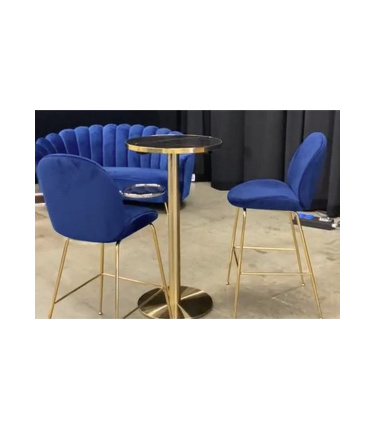 En location, la chaise de bar bleu et pieds dorés H 115 cm s’adapte à de nombreuses configurations. Elle peut être associée à un comptoir ou une table haute pour accueillir vos invités dans un espace convivial. Dans un décor lounge, elle se combine parfaitement avec des canapés en velours assortis ou des tables hautes à plateau bois ou marbre pour une ambiance plus chic. Idéale pour les cocktails, les corners VIP ou les zones d’attente élégantes, elle apporte confort et style sans surcharger l’espace.
