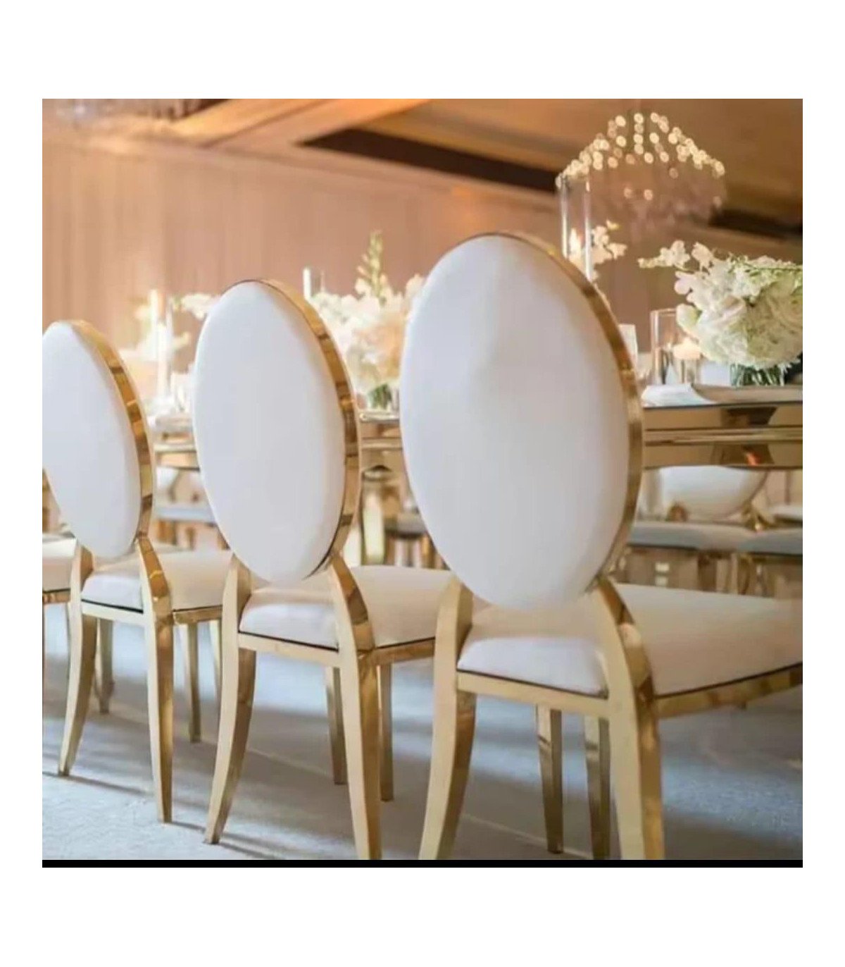 Cette chaise médaillon en métal doré avec galette interchangeable est une solution élégante et pratique pour l’aménagement de vos événements. Avec son dossier ovale caractéristique, sa structure en métal doré et sa galette amovible en simili cuir blanc, elle s’intègre facilement dans des univers variés. Robuste et empilable, ce modèle convient parfaitement aux réceptions nécessitant une mise en place rapide, sans compromis sur l’esthétique. Elle est disponible à la location pour tous vos événements à Paris, en Île-de-France et partout en France.