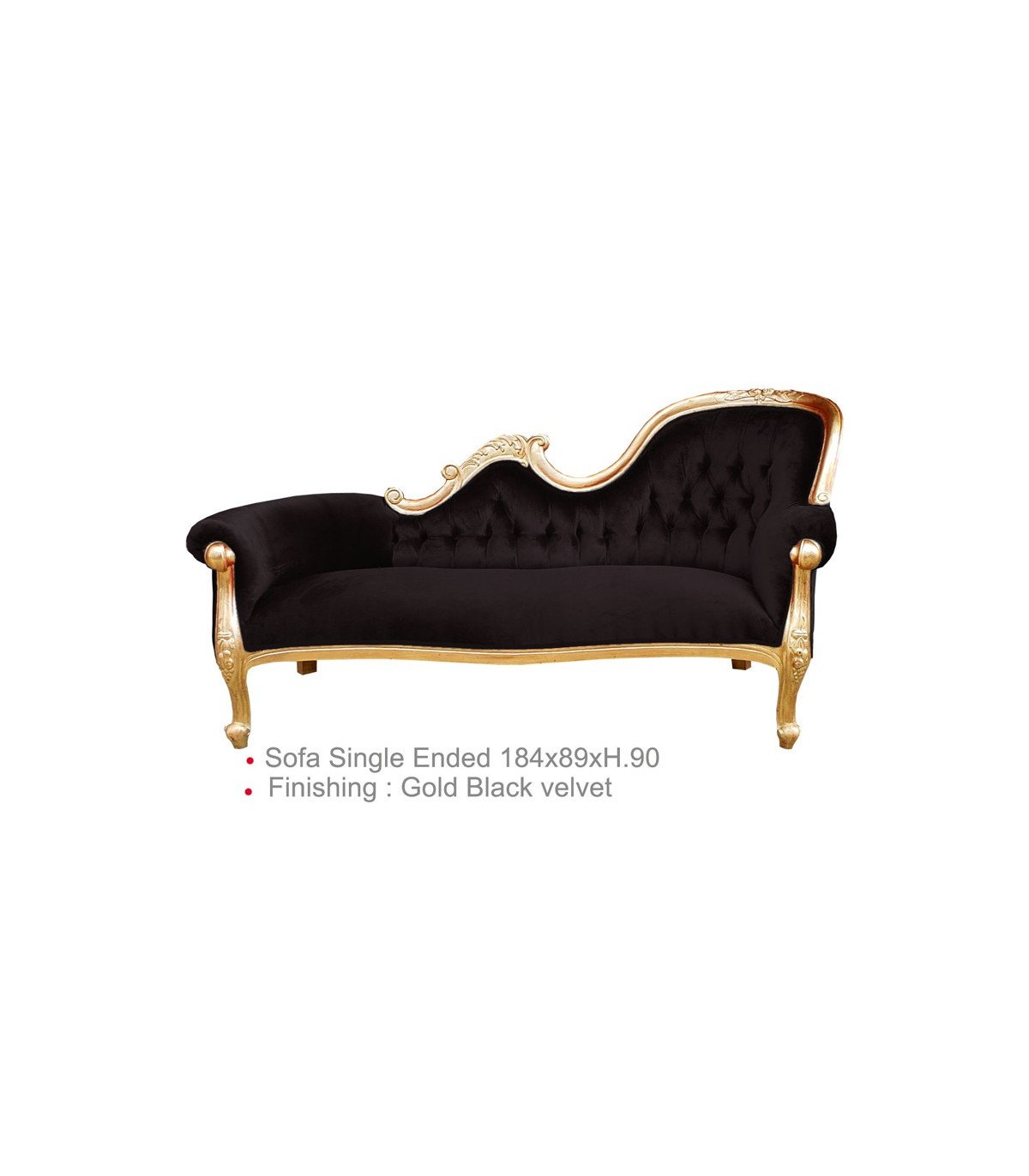 Pour une décoration évènementielle réussie, optez pour la location de notre méridienne dorée et capitonnée de velours noir.