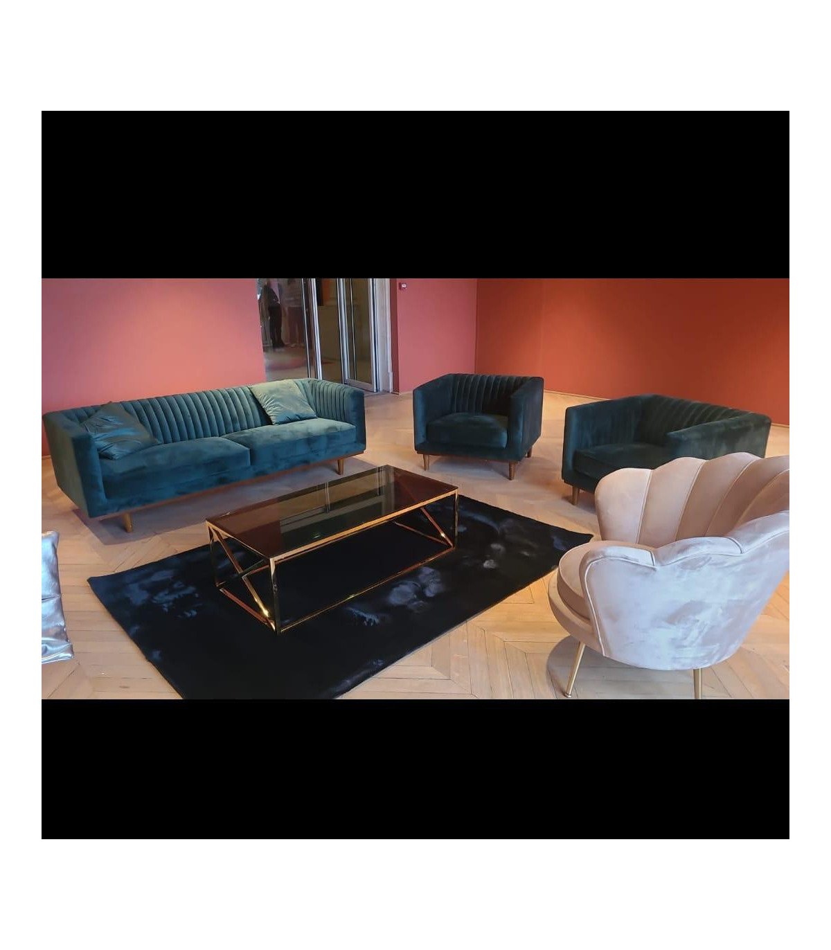 Ce canapé 3 places en velours vert de style vintage vous est proposé à la location pour vos événements professionnels sur Paris ou en Ile de France.