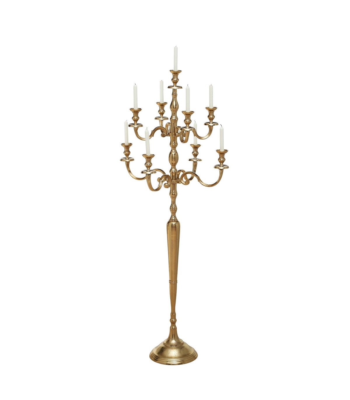 Ce chandelier doré H 180 cm apporte une présence visuelle forte grâce à sa hauteur et à ses neuf branches. Sa structure en métal offre une silhouette élancée qui permet de créer un point focal dans une salle, un hall ou une scène. Ce modèle convient aux décorations élégantes et donne immédiatement un cadre lumineux lors d’un mariage, d’une réception ou d’un événement premium. Sa hauteur facilite son intégration dans des espaces variés, sans gêner la circulation ou la visibilité.