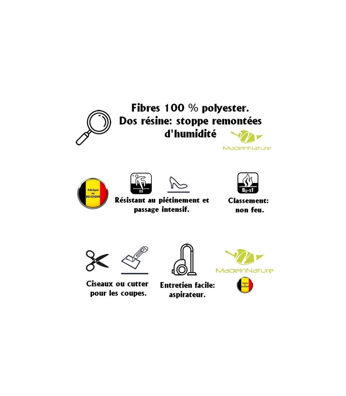 Fabriquée en polypropylène avec velours ras, cette moquette est antistatique. Ce tapis est traité non feu pour respecter les normes de sécurité. Elle est recommandée pour un usage événementiel en intérieur ou en extérieur Salon, Foire, Fête de fin d'Année.