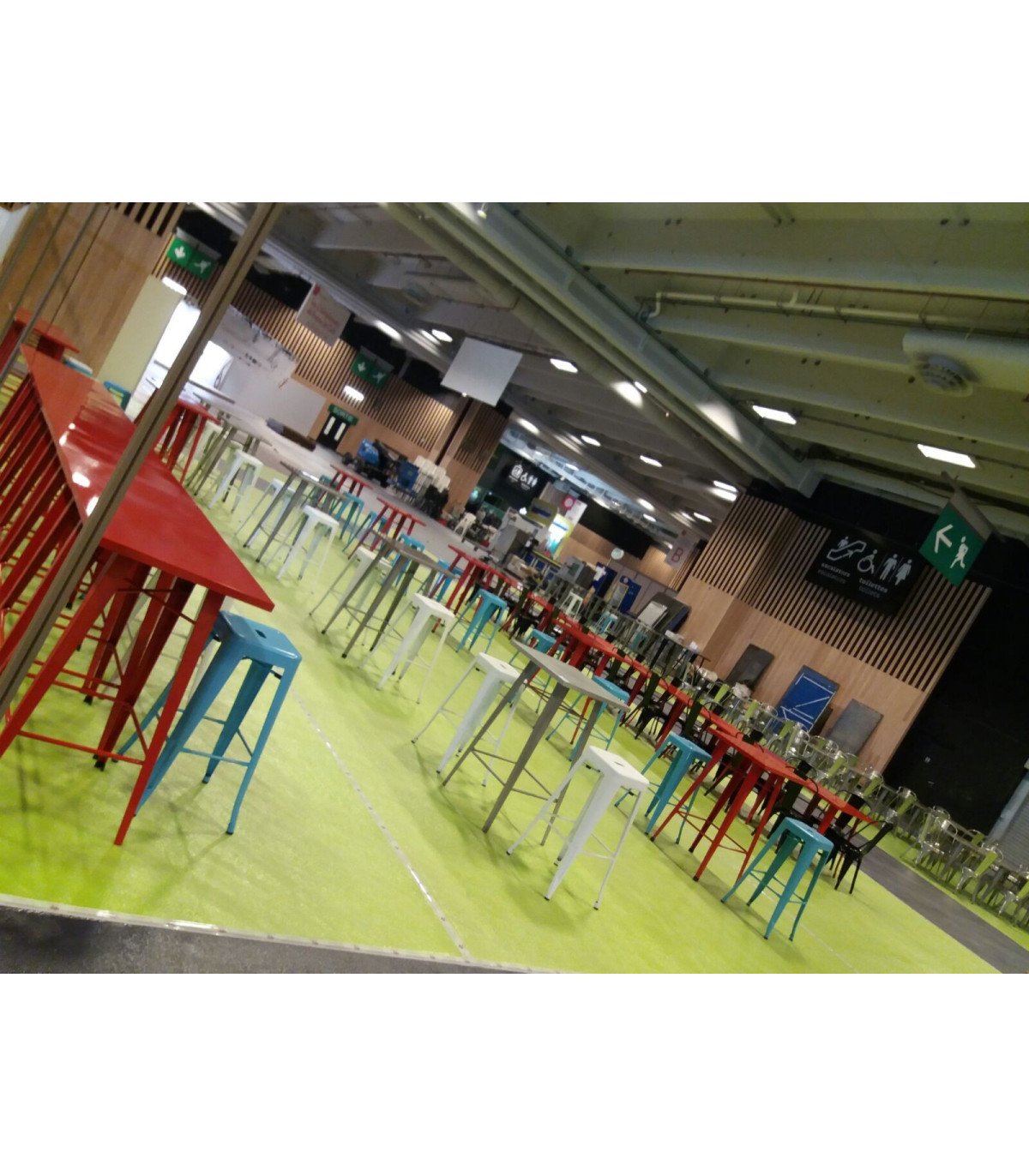 Le tabouret haut métal rouge assise 76 cm trouve facilement sa place dans un espace de networking, un corner de présentation produit ou une zone de dégustation. Sa couleur vive fonctionne particulièrement bien dans les environnements monochromes ou à dominante sombre, pour créer un point focal visuel. Associé à une table haute noire, bois clair ou acier brut, il permet de composer une scénographie impactante dans un salon professionnel, un lancement de produit ou une soirée d’entreprise.