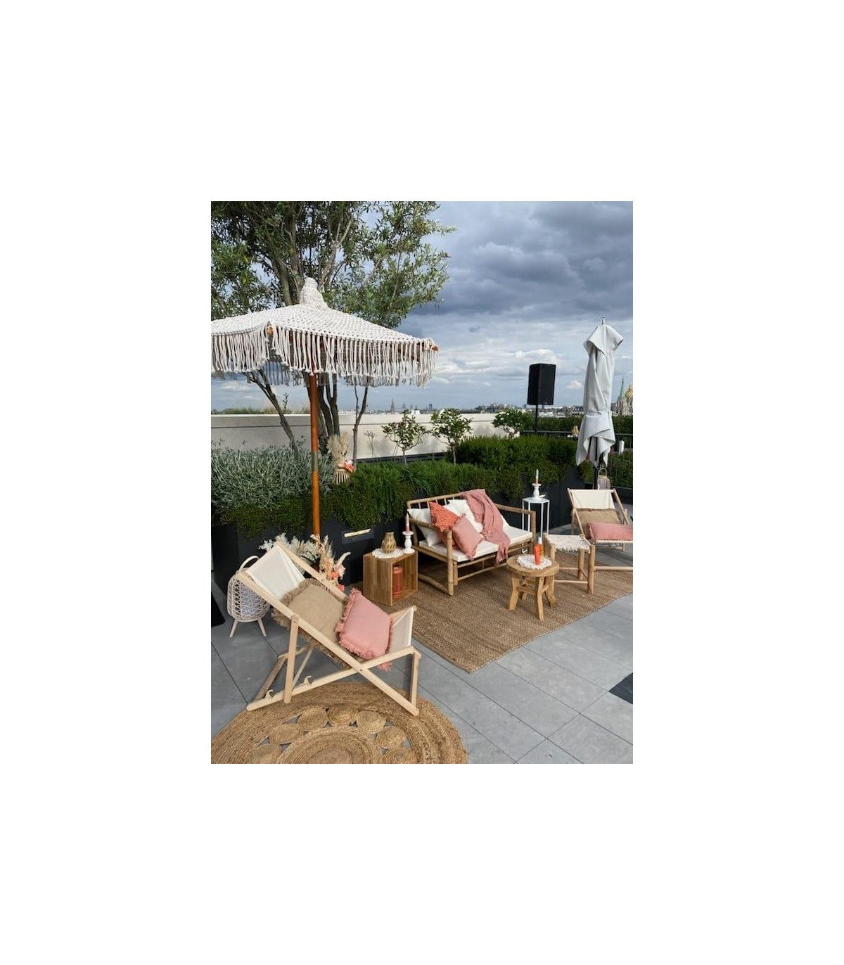 Que ce soit pour créer un coin lounge en extérieur, agrémenter une scénographie ou ajouter une note tropicale à un stand lors d’un salon, ce parasol en macramé s’adapte à tous vos besoins. Il est souvent utilisé pour :