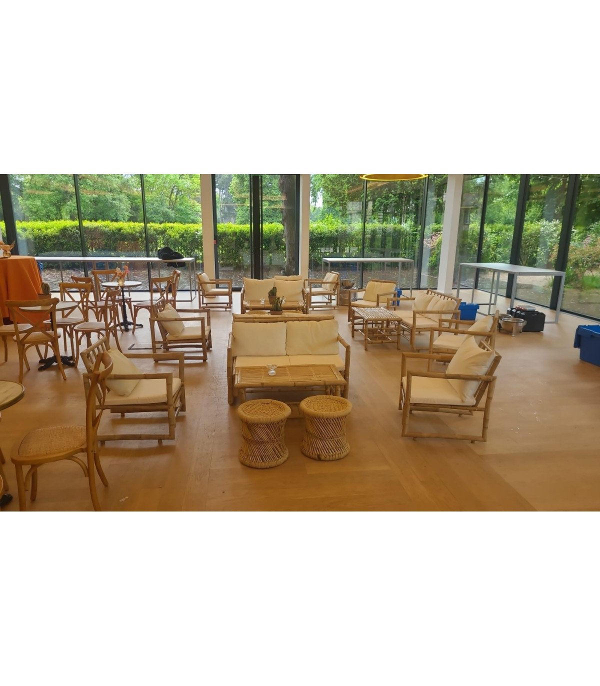 Le canapé 2 places en bambou L 115 séduit par son esprit nature et son esthétique bohème. Avec son gabarit compact, il s’intègre facilement dans tout type d’agencement : coin lounge, espace détente ou scène événementielle. Très apprécié pour les shootings photo, les mariages en plein air ou encore les salons à thème éco-chic, ce canapé invite à la convivialité et à la détente.