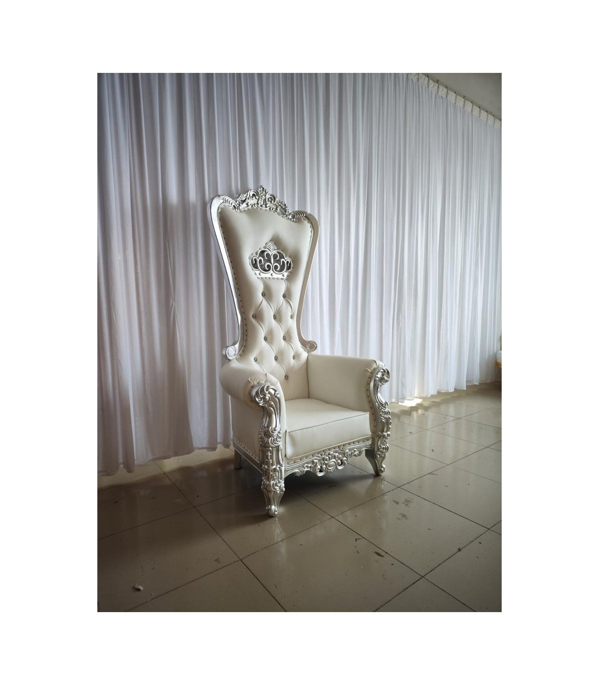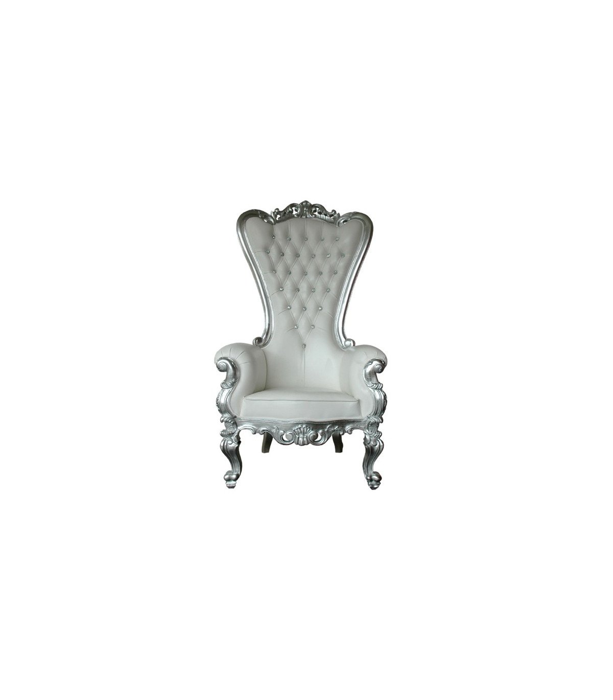 Ce trône de mariage argent et blanc se distingue par sa silhouette haute de 180 cm et son travail décoratif soigné. Son dossier capitonné en cuir blanc, agrémenté de strass effet cristal, contraste avec une structure en bois sculpté finition argentée. Pensé pour valoriser les mariés, il attire immédiatement le regard et structure un espace de réception ou de prise de vue.